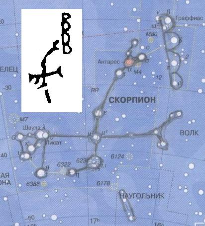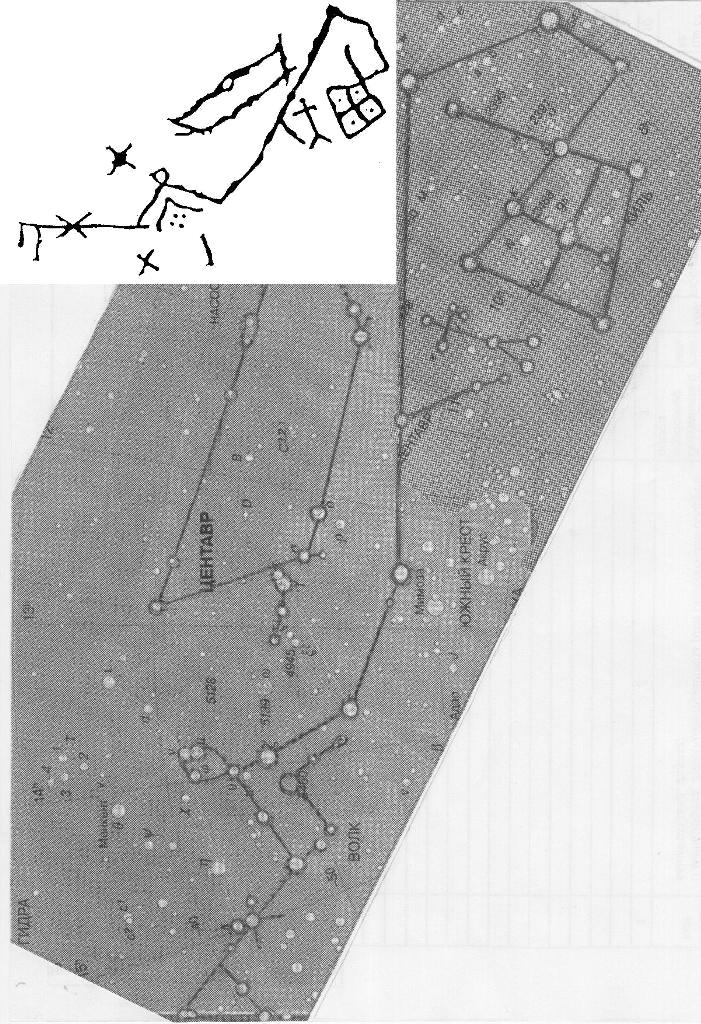 4. Наблюдение за звездами. Движение звездной сферы можно сравнить с точным хронометром. Положение звезд на небе меняется в течение ночи и это можно использовать для измерения суточного времени. Начальное положение созвездий и звезд на небосводе после каждой вечерней зари меняется в соответствии с сезонными изменениями и это можно использовать для измерения сезонного времени. Конечно, все это использовалось древними астрономами. Если в Древнем Египте первое появление Сириуса перед восходом солнца предвещало разлив Нила, то почему бы первое появление этой ярчайшей звезды северного неба не могло предвещать какого-либо сезонного или календарного события для жителей древнего Акбаура? Могло. Причем появление этой звезды во впадине между двумя горными склонами южного горизонта Акбаура (если наблюдать от каменной стенки) должно было выглядеть очень эффектно. То, что древние астрономы Акбаура вели систематические наблюдения за звездным небом и умели составлять из звезд созвездия, хорошо иллюстрируется изображениями созвездий на стене грота, которые они оставили после себя. Некоторые из изображений хорошо идентифицируются с современными созвездиями, конечно, с некоторыми отличиями, что и должно быть. Другие же нужно еще идентифицировать, что требует времени и кропотливого труда. Причем некоторые из изображенных созвездий в настоящее время не видны или видны частично с данной широты. Ретроспектива, сделанная на основании прецессионного смещения земной оси, показывает древность этих изображений около 4700 лет до н.э. Только тогда могли быть видны эти созвездия с широты Акбаура. Увеличивая древность, мы уменьшаем эту возможность, уменьшая – тоже. Ниже приводятся рисунки двух изображений из грота: первое изображение (Рис.1) включает в себя звезды таких современных созвездий как Волк, Центавр, Паруса и Киль и в настоящее время не видны. Второе же (Рис.2) наоборот состоит из двух частей современного Скорпиона, который сейчас виден только наполовину.