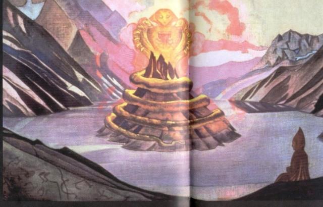 Рис. 2 Подобного примера нет в мире. Это уникальное свидетельство древности этих изображений до сих пор не оценено официальной наукой. Обнаружена нить, ведущая от Акбаура к северной провинции Индии Сикким, где в 1924 году Н.К.Рерих на берегу озера Юцзо (на берегу которого по преданиям медитировал и обрел просветление индийский Риши Нагарджуна) рисовал картину «Нагарджуна победитель Змея». Если посмотреть внимательно на эту картину, то в левом углу можно увидеть некие знаки, изображенные на наклонной плите скалы. Эти изображения такого же типа, как и в гроте Акбаура. Известно, что Н.К.Рерих с фотографической точностью изображал на своих картинах наскальные изображения, когда писал с натуры и включал их в свои картины. Это наводит на мысль, что народ, который жил и творил в Акбауре пришел в давние времена оттуда, из северной Индии. А ведь Н.К.Рерих размышлял и писал в своих трудах именно о великом переселении народов с Востока на Запад, следы которого он обнаруживал везде по пути своего следования во время его экспедиции через Центральную Азию. Ниже я привожу отсканированное изображение названной картины на Рис.3.