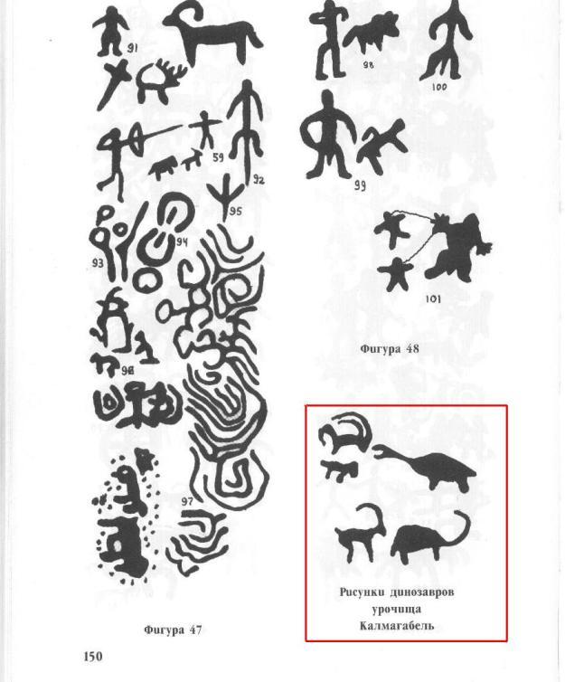 Листая страницы замечательной книги замечательного ученого-энтомолога, профессора П.И.Мариковского «В стране каменных курганов и наскальных рисунков» (Алматы, 2005), среди многих других рисунков мы можем найти изображения динозавров-диплодоков (Стр.145, 147 и 150).